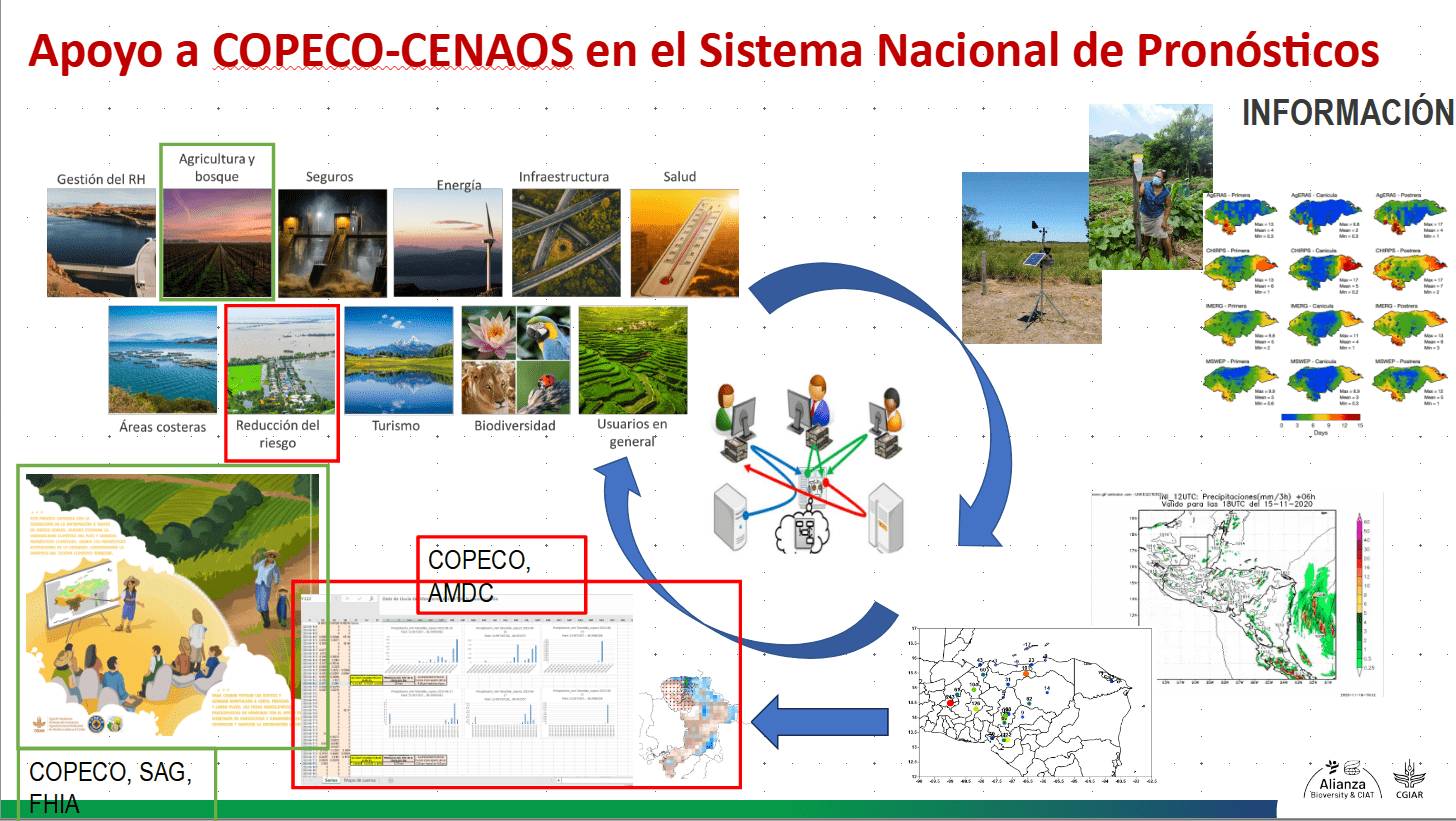 Otro beneficio de esta alianza es el apoyo que brinda a COPECO-CENAOS en su sistema de pronósticos, haciendo accesible al público información importante para la reducción del riesgo, agricultura y bosque, gestión del recurso hídrico y salud entre muchos más.